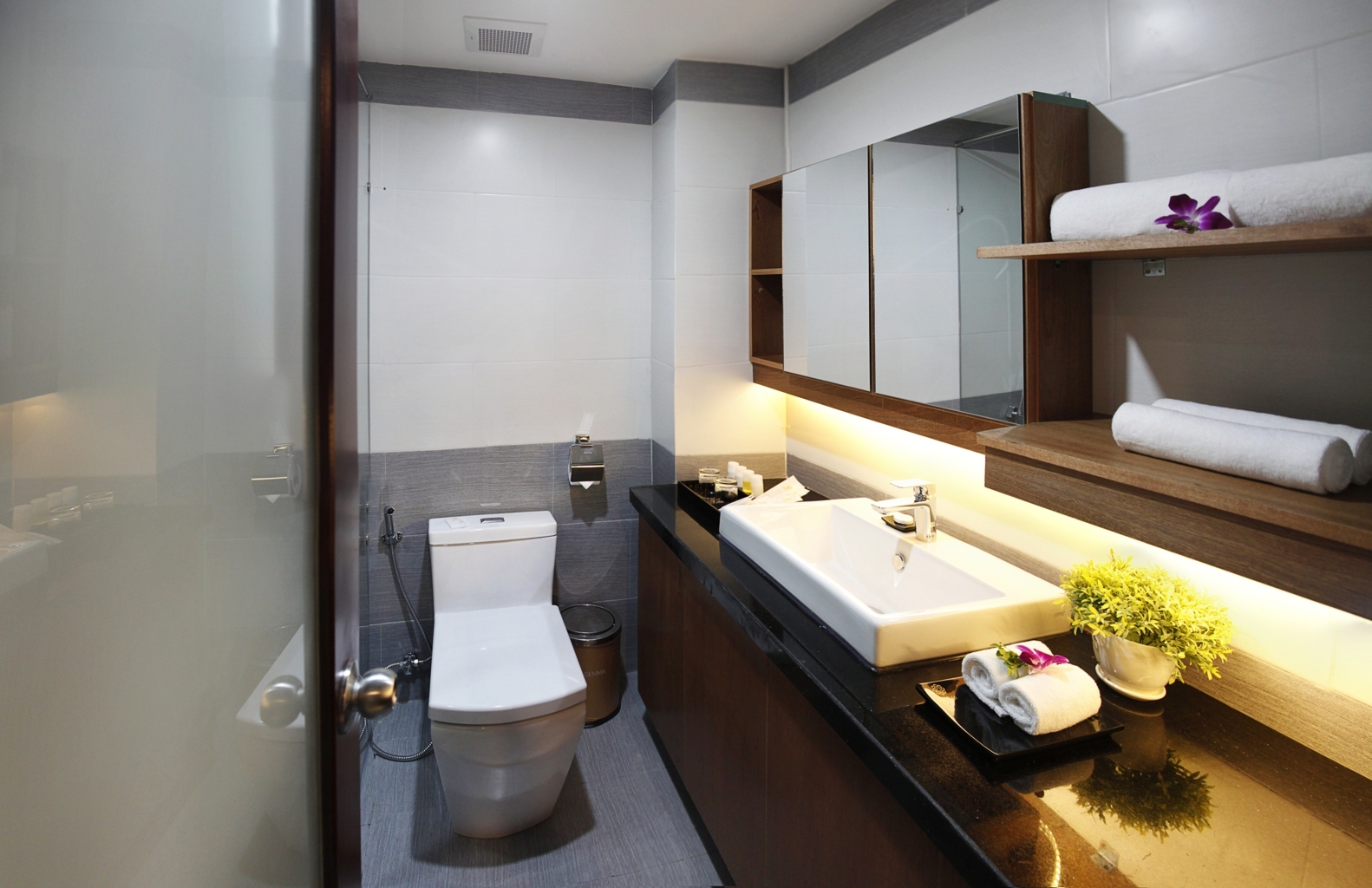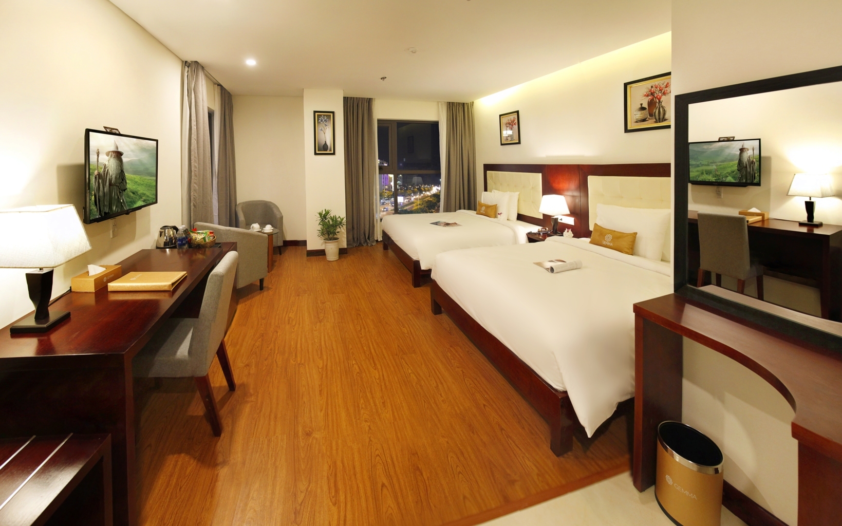 The light and spacious 40 meter Rooms feature contemporary decor, twin king-sized beds, a large bathroom with shower, workstation, 32" LCD TV, free Wi-Fi access, in-room safe, refrigerator, and tea and coffee-making facilities.